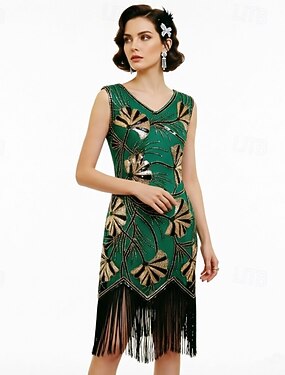 Бурные 20-е 1920-е годы Ретро До колена Платье для флаперов Без рукавов Великий Гэтсби чарльстон Пайетки Лист Маскарадный костюм Жен. Хэллоуин Карнавал Для вечеринки / ужина Взрослые Платье Все сезоны