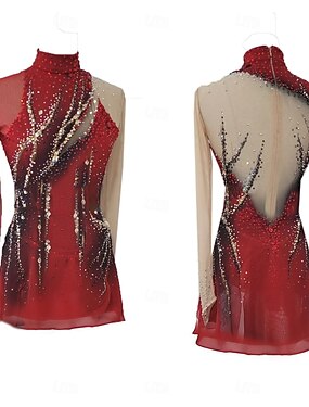 Платье для фигурного катания Жен. Девочки Катание на коньках Платья Черный / красный Пэчворк Сетка Эластичность Учебный Соревнование Одежда для фигурного катания Классика Стразы Длинный рукав