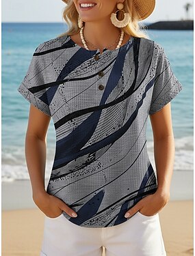 Жен. Футболка С принтом Кнопки на груди Геометрический принт Стиль Современное На каждый день С короткими рукавами Хенли Обычные топы Повседневные Темно синий Лето Весна