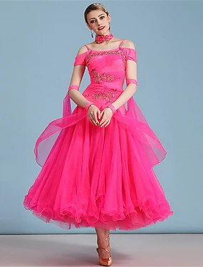 женское платье для бальных танцев, ярко-розовое, с цветочной аппликацией из страз, многослойной органзы, элегантное, для выступлений на соревнованиях по вальсу, танго, фокстроту