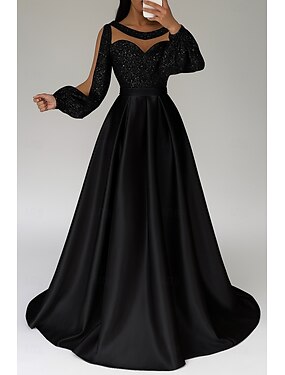 А-силуэт В пол Выпускные платья Вечернее платье С пышной юбкой Торжественное платье Элегантный стиль Шелковистость Длинный рукав Иллюзионный декор Свадьба Официальные