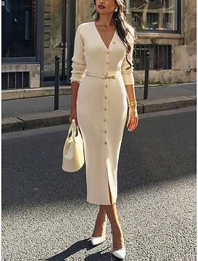 Жен. Платье-свитер Элегантный стиль На каждый день Мягкий Сплошной цвет Чистый цвет Рельефный узор V-образный вырез Трикотаж Длинный рукав Длинные топы Вязать на открытом воздухе Повседневные выходные