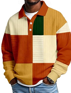Муж. Геометрический принт Контрастных цветов Рубашки-поло из вафельной ткани Текстура Длинный рукав Футболки поло Лацкан На каждый день Одежда для спорта и отдыха На каждый день 3D печать