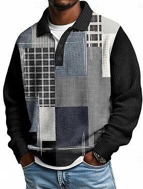 Муж. В клетку Рубашки-поло из вафельной ткани Рубашка для гольфа Длинный рукав Футболки поло Рубашки с воротником На каждый день Одежда для отпуска Официальная одежда Праздничная одежда Пуговицы 3D