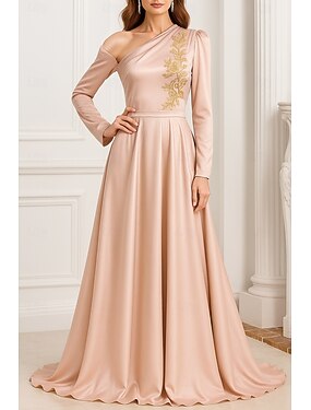 А-силуэт В пол Вечернее платье Торжественное платье Элегантный стиль Шелковистость Длинный рукав С открытыми плечами Свадьба Официальные Сатин с Аппликации Карман
