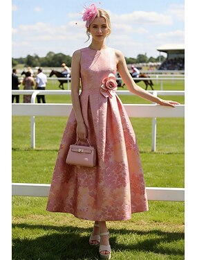 А-силуэт Ниже колена коктейльные платья Платья для вечеринок Элегантный стиль Без рукавов Круглый вырез Свадьба Официальные Розовое платье Сатин с Принт
