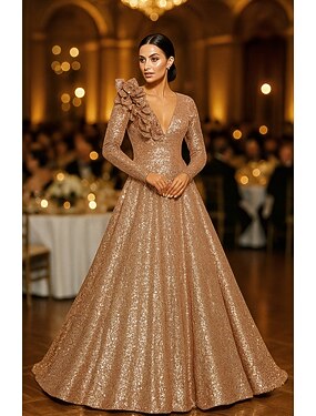 А-силуэт В пол Вечернее платье Торжественное платье Элегантный стиль Блестящие Длинный рукав V-образный вырез Свадьба Официальные Пайетки с Блеск Пайетки