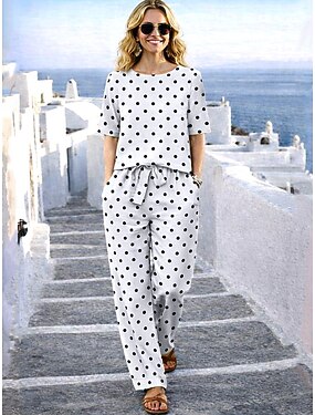 Жен. Комплекты хлопкового льна С короткими рукавами Элегантный стиль Богемия Активный Повседневные Синий Белый Розовый Лето Стандартный