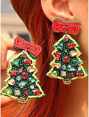 женские серьги из бисера в виде елки с красным бантом и отделкой из драгоценных камней — праздничные украшения для рождественской вечеринки