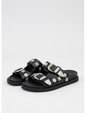 женские черные сандалии-слайды в стиле вестерн - сандалии с ремешками, украшенные серебряной пряжкой, для летних образов в стиле бохо и повседневных нарядов