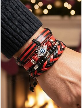 Мужской комплект браслетов из искусственной кожи, красные и черные плетеные браслеты с элементами от сглаза и бусинами, стильный для Рождества, несколько узоров
