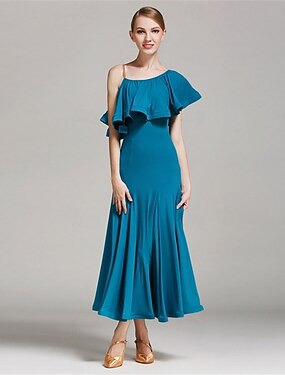 элегантное бальное платье на одно плечо с оборкой на рукаве и струящейся юбкой для танцевальных выступлений и репетиций