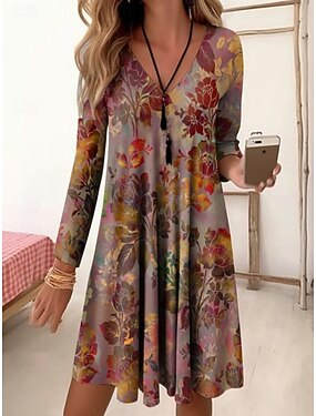 Жен. Мини-платье Платье A-силуэта На каждый день Повседневные Стандартный Цветочный принт В клетку Длинный рукав V-образный вырез Красный Синий Серый Весна Осень