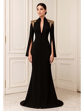 Русалка В пол Выпускные платья Вечернее платье С пышной юбкой Торжественное платье Элегантный стиль Маленькое черное платье Высокий раскол Длинный рукав С открытыми плечами Официальные Стретч-креп с