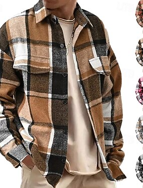 Муж. Shacket Куртка-рубашка Зимняя куртка В клетку Отпуск На каждый день Черный Винный Оранжевый Цвет хаки Длинный рукав Лацкан Осень Зима Одежда Карман