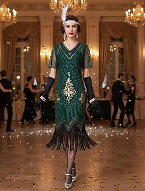Бурные 20-е 1920-е годы Коктейльные платья До щиколотки Платья Инвентарь Платье выпускного вечера Короткие рукава Великий Гэтсби Большие размеры Свадебный гость С кисточками С кисточками V