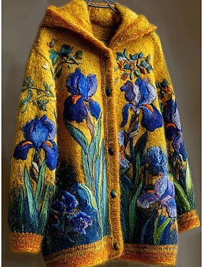 Жен. Кардиган Повседневные На каждый день Цветочный принт Графика Рельефный узор Капюшон Пэчворк Карман Цветочный Длинный рукав Длинные топы Вязать на открытом воздухе выходные Желтый Осень Зима