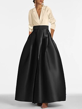А-силуэт В пол Вечернее платье С пышной юбкой Торжественное платье Элегантный стиль Для вечеринки Цветовые блоки Длинный рукав V-образный вырез Свадьба Черный галстук Гость на осенней свадьбе