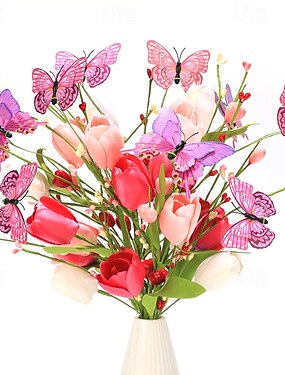 3 искусственных стебля тюльпанов, искусственные цветы для Дня матери, Международного женского дня, Дня святого Валентина, свадьбы, домашнего декора, зелени, акцентов в виде бабочек, цветочной