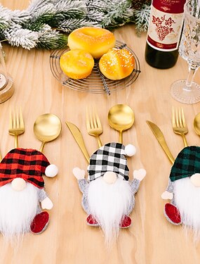 рождественский гном, столовые приборы, держатель для столовых приборов в виде гнома в клетку, набор столовых приборов в виде лесного старика, украшение стола
