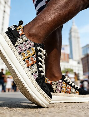 Мужские повседневные кроссовки с разноцветным узором – дышащий холст, шнуровка, легкая обувь для повседневной носки, путешествий и городского стиля.