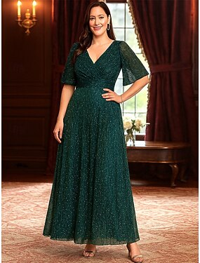 Платье для гостей на свадьбу A-Line до щиколотки Официальные платья Вечернее платье Платье матери невесты Полу рукав V-образный вырез Плюс размер Сияние и блеск с однотонным цветом