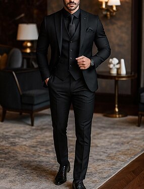 Мужской Свадьба Бизнес Твидовые костюмы Лацкан с тупым углом Черный Формальная Однотонный Узкий крой Набор из 3 предметов Однобортный с 2 пуговицами