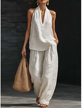 Жен. Смешанная хлопковая ткань Комплекты, вдохновленные льном Комплекты из двух предметов Без рукавов V-образный вырез Сплошной цвет Дуббеле Рий Кнопен Активный Классический Отпуск На каждый день