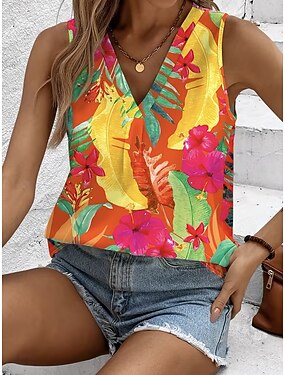 Жен. Безрукавка Цветочный принт Графика Растения Элегантный стиль Винтаж тропический Без рукавов V-образный вырез Обычные топы Повседневные Красный Оранжевый Лето Весна