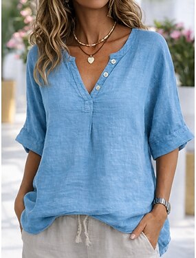 Жен. Блуза Рубашка из искусственного льна Пуговицы Сплошной цвет Стиль На каждый день Рукав 3/4 V-образный вырез Обычные топы Повседневные Синий Черный Желтый Пурпурный Серый Лето Весна Осень