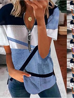 Жен. Футболка Молния Графика Геометрия Стиль Классика На каждый день С короткими рукавами Вырез под горло Обычные топы Повседневные выходные Синий Розовый Зеленый Хаки Лето Весна