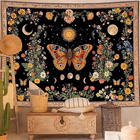 Гобелен с бабочками, настенное панно, небесное солнце, луна, звезды, фазы луны, цветочный узор, бохо, хиппи, декор для дома, для спальни и гостиной.