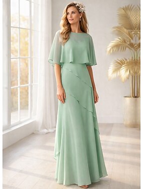 А-силуэт В пол Свадебное платье для гостей Вечернее платье Многоярусное платье Платье для матери невесты Рукав до локтя Вырез под горло Элегантный стиль Свадебный гость Помолвка Шифон с