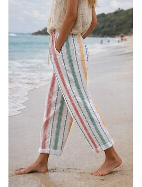 Женские брюки из искусственного хлопка и льна, повседневные, в стиле уличной моды, длинные, с натуральным цветочным принтом, однотонные, полосатые, с карманами, эластичным шнурком, удобные для повседневной носки на открытом воздухе, красного, орехового, б