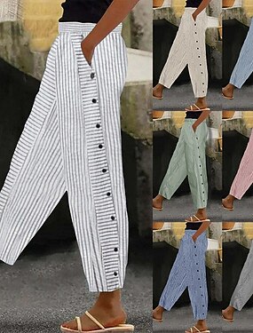 Жен. Брюки из хлопка и льна Чино Прямой силуэт Классический На каждый день Полная длина Завышенная Полоски Карман Эластичный пояс Рисунок удобный Мягкий Удобный Эластичная