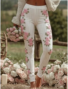 Жен. Леггинсы Уютные леггинсы Отпуск Винтаж На каждый день Полная длина Завышенная Цветочный принт Рисунок Удобный Эластичная Повседневные Отпуск Для улицы Белый Весна Осень Зима Приталенный крой