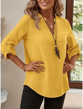 Жен. Рубашки из хлопка и льна Летние вершины Блуза Нарядные Топы Рюши Пэчворк Карман Сплошной цвет Полотняное плетение Элегантный стиль Винтаж Дамы Рукав 3/4 Рубашечный воротник Обычные топы