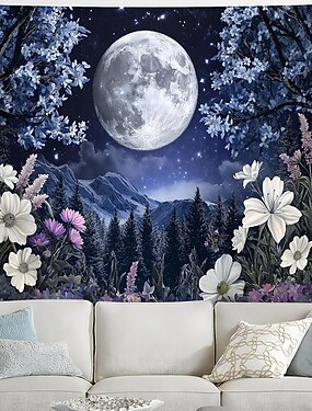 Гобелен с изображением полной луны и ночного неба, настенное панно, заснеженный горный пейзаж, белые цветочные мотивы, лес, звезды, сцена природы, большое полотно, декор для дома, настенное панно,