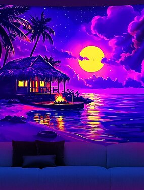 Гобелен, светящийся в ультрафиолете, тропическая пляжная хижина под светящейся полной луной, настенное панно с УФ-реактивным эффектом, психоделический декор для спальни, общежития, вечеринки.