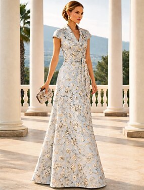 А-силуэт В пол Свадебное платье для гостей Вечернее платье Платье для матери невесты С короткими рукавами Лацкан Элегантный стиль Винтаж Свадьба Официальные Жаккард с Бант(ы) Карман