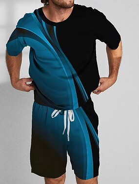 Муж. геометрический Линии 2шт Наборы футболок Летние вершины С короткими рукавами Короткие штаны Вырез под горло Спорт На каждый день Для занятий спортом Повседневные 3D печать Лето Синий / Черный