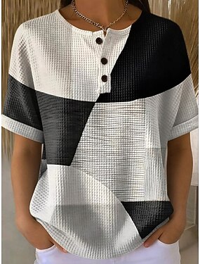 Женская вафельная футболка с цветными блоками графическим принтом геометрической абстракцией винтажная стильная классическая с коротким рукавом круглый вырез длинные топы для повседневного