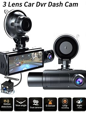 3,16-дюймовый видеорегистратор высокой четкости 1080p с тремя объективами, функцией циклической записи изображения при движении.