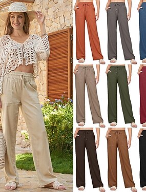 Жен. Брюки из хлопка и льна Штаны Летние штаны Пляжные штаны Отпуск Классический На каждый день Полная длина Завышенная Полотняное плетение Широкие Эластичный пояс Мягкий Удобный Дышащий Эластичная