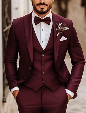 Мужской Свадебные костюмы Повседневные Бизнес Бордовый Весна, осень, зима, лето Костюм Лацкан с тупым углом Формальная Однотонный Приталенный крой Набор из 3 предметов Однобортный с 2 пуговицами