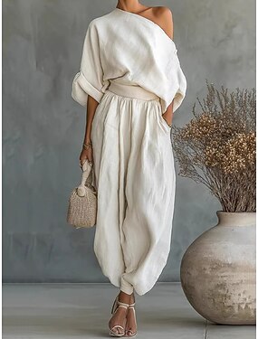 Жен. Комплекты хлопкового льна Комплекты брюк Болеро Длинный рукав С открытыми плечами Полотняное плетение Рюши Пэчворк Элегантный стиль Мода Уличный стиль Повседневные на открытом воздухе Офис