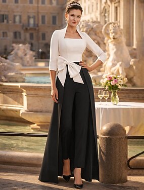 Брючный костюм До щиколотки Платье для матери невесты Рукав 3/4 Квадратный вырез Элегантный стиль Для вечеринки Официальные Свадебный гость Эластичная ткань с Бант(ы) Цветовые блоки