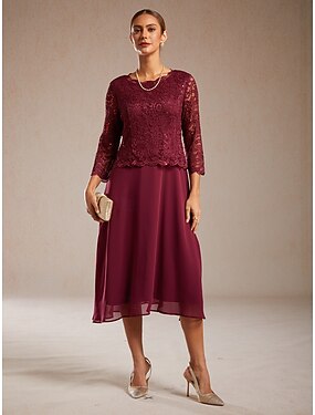 Жен. Платье средней длины Платье A-силуэта Элегантный стиль Для вечеринок Свадебный гость Кружева Стандартный Сплошной цвет Рукав 3/4 Вырез под горло Винный
