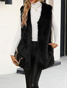 Жен. Жилет Искусственное меховое пальто Сохраняет тепло Удобный Карман Меха и кожа Мода На каждый день Полотняное плетение Отпуск Для улицы Повседневные На каждый день Длинная V-образный вырез
