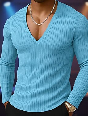 Муж. Футболка Трикотажная футболка в рубчик Рубашка с длинным рукавом Длинный рукав Глубокий V-образный вырез Весна Осень Зима Сплошной цвет Полотняное плетение Пит Стрип